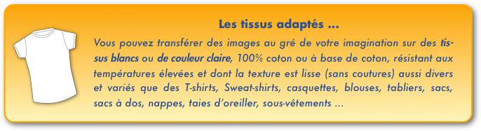 Vous pouvez transférer des images sur T-shirts, Sweat-shirts, tabliers, sacs, nappes, taies d’oreiller ...